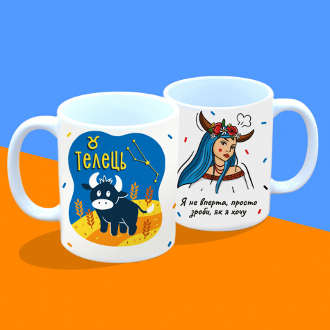 На чашке – милый символ знака Телец на насыщенном сине-жёлтом фоне и портрет энергичной девушки с венком и рогами, подчёркивающий её силу и характер. Дополняет дизайн надпись «Я не упрямая, просто сделай, как я хочу» – настоящее кредо харизматичной представительницы этого знака.