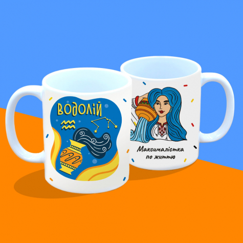 Эта стильная подарочная чашка с насыщенным сине-оранжевым фоном, символом Водолея и современным женским портретом с шутливой надписью «Максималистка по жизни» идеально подчёркивает её неординарность и любовь к свободе.