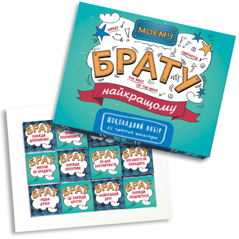 Шоколадный набор «Брату» 60 г Вкусный и душевный подарок для самого лучшего брата! Набор из 12 мини-плиточек молочного шоколада наполнен тёплыми пожеланиями, которые скажут о вашей любви и благодарности лучше любых слов. Каждая обёртка – маленькое напоминание о том, как здорово иметь такого надёжного друга рядом. Вес – 60 г (12 мини-шоколадок). Шоколад – нежный молочный 33% с насыщенным вкусом. Размер коробки – 16,5 × 13 × 1,7 см Срок годности – 10 месяцев. Идеальный презент на день рождения, именины или просто как знак внимания.