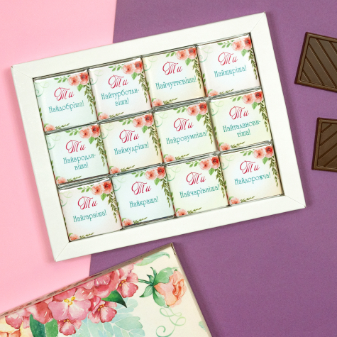 Шоколадный набор «Моей любимой Мамочке» 60 г Самый нежный подарок для самой дорогой женщины – вашей мамы. В этой изящной коробочке спрятаны 12 мини-плиточек молочного шоколада (33% какао), каждая с трогательными словами благодарности, комплиментами и признанием в любви. Каждая плиточка словно шепчет: «Мама, ты – моё сердце и вдохновение». Вес – 60 г (12 мини-шоколадок в нежных индивидуальных обёртках). Шоколад – молочный Размер коробочки – 16,5 × 13 × 1,7 см Срок хранения – 10 месяцев. Прекрасный сюрприз, который наполнит сердце мамы теплом и напомнит, как сильно вы её любите.