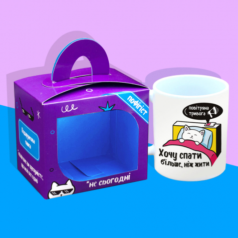 Ця керамічна чашка з кумедним котиком і написами «Хочу спати більше, ніж жити» та «Пофігist по життю» ідеально підійде для людей із здоровою іронією та філософським підходом до життя.