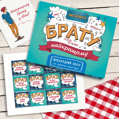 Шоколадний набір «Брату» 60 г Смачний і щирий подарунок для найкращого брата у світі! Цей набір із 12 міні-плиточок молочного шоколаду збереже тепло родинних почуттів і розповість більше, ніж тисячі слів. На кожному шматочку – теплі побажання, що нагадають братові, як важливо мати такого надійного друга поруч. Вага – 60 г (12 міні-шоколадок). Шоколад – ніжний молочний 33% із насиченим смаком. Розмір коробки – 16,5 × 13 × 1,7 см Термін придатності – 10 місяців. Ідеальний презент до дня народження, іменин або просто як знак вдячності та любові до брата.